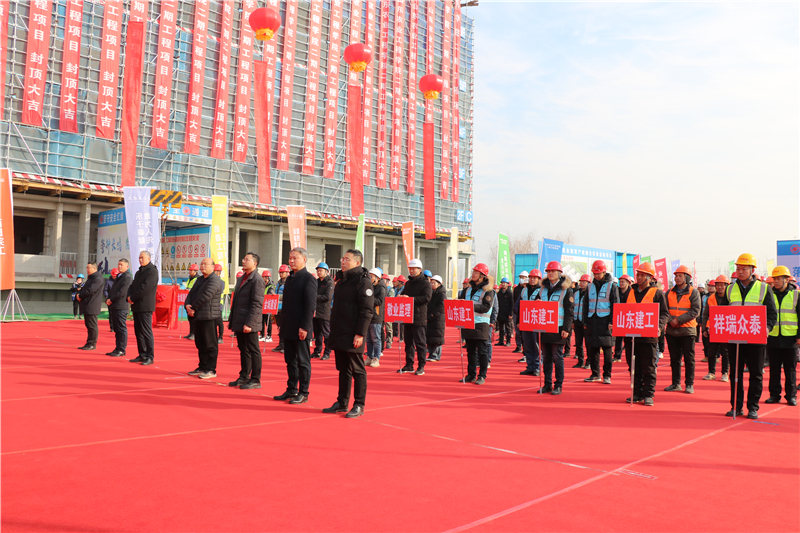 元月29日上午,集團承建的山東農(nóng)業(yè)工程學院二期10號學生公寓喜封金頂。山東農(nóng)業(yè)工程學院黨委書記張鴻波,黨委委員、副院長周吉鵬;淄博市教育局黨組書記、局長孫英濤;淄博市項目建設工作專班副主任李詠芹、耿慶永;集團黨委書記、董事長王彥宏,總會計師郭洪濤,副總經(jīng)理、三直屬公司總經(jīng)理宋吉鋒出席封頂儀式。